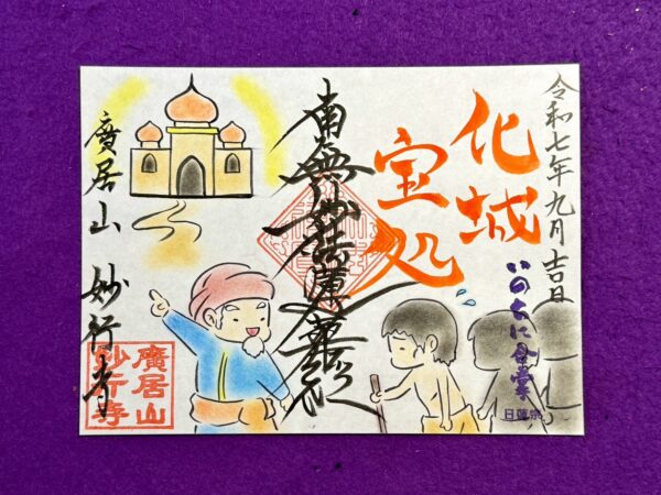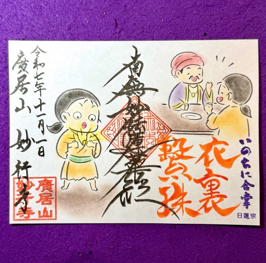御朱印・御首題 ご注意下さい 中村公園にある清正公で有名な妙行寺様に間違えて問い合わせ、行かれる方が多いです。妙行寺様に迷惑がかかりますからご注意ください。 御朱印とは 本来の御朱印は寺院を参拝し写経を納めた証でした。現在では参拝の証としての御朱印が一般的であり、妙行寺も参拝の証として御朱印をお書きしております。御朱印は御札などと同等とされる物ですから粗末に扱わないようにして下さい。 妙行寺の御朱印・御首題 御朱印対応日の10時、11時、14時、15時、16時、17時、18時、19時の一日最大8枠となります。1枠あたり1時間で、御朱印・御首題をお書きし、先祖供養、ご祈祷のお経をあげます。お経の後に御朱印や御首題の説明や簡単な法話、閑談などいたします。【ご注意下さい】・法務などで留守の場合が多いので必ずご予約の上、お越しください。・誕生日御朱印はご予約時にお知らせください。お伝えいただかないとお書きできない場合がございます。・白い紙の御朱印帳以外は必ず対応できるかご確認ください。・急な法務により、対応日、ご予約の変更などをお願いする事があります。 御朱印・御首題をもらうには その場で書く場合は法務などの都合によりお受けできない場合もございます。必ずご予約の上お越しください。 御朱印・御首題のご予約 [オンライン予約はこちら] 電話: 052-412-0567※携帯電話から折り返す場合がございますLINE @pnh4218u>> 御首題・御朱印の郵送についてはコチラ ご志納金について 金額はきまっておりません。お気持ちでお願いいたします。お帰りの際、本堂にてお渡し下さい。 御朱印の種類について 【御首題】・黒の御首題・カラーの御首題【御朱印】・黒の御朱印・カラーの御朱印【今月のイラスト御朱印(通常の御朱印帳の2面サイズ)】・法華七喩5 衣裏繋珠【イラスト御朱印(通常の御朱印帳の2面サイズ)】・法華七喩1 三車火宅・法華七喩2 長者窮子・法華七喩3 三草二木・法華七喩4 化城宝処・最上稲荷と蓮・栄世 十一面観音・七面天女・誕生日御朱印(観音様) ※当月が誕生日の方限定・誕生日御朱印(白雪稲荷様) ※当月が誕生日の方限定・誕生日御朱印(鬼子母神様) ※当月が誕生日の方限定・誕生日御朱印(大黒様) ※当月が誕生日の方限定名古屋でコラボご首題については公式HPへ 法華七喩1 三車火宅 法華七喩2 長者窮子 法華七喩3 三草二木 法華七喩4 化城宝処 法華七喩5 衣裏繋珠 七面天女 妙行寺御首題帳限定 御首題 誕生日御朱印(鬼子母神様) 誕生日御朱印(白雪稲荷様) 誕生日御朱印(観音様) 誕生日御朱印(大黒様) 稲荷と蓮 栄世十一面観音 御首題 御朱印